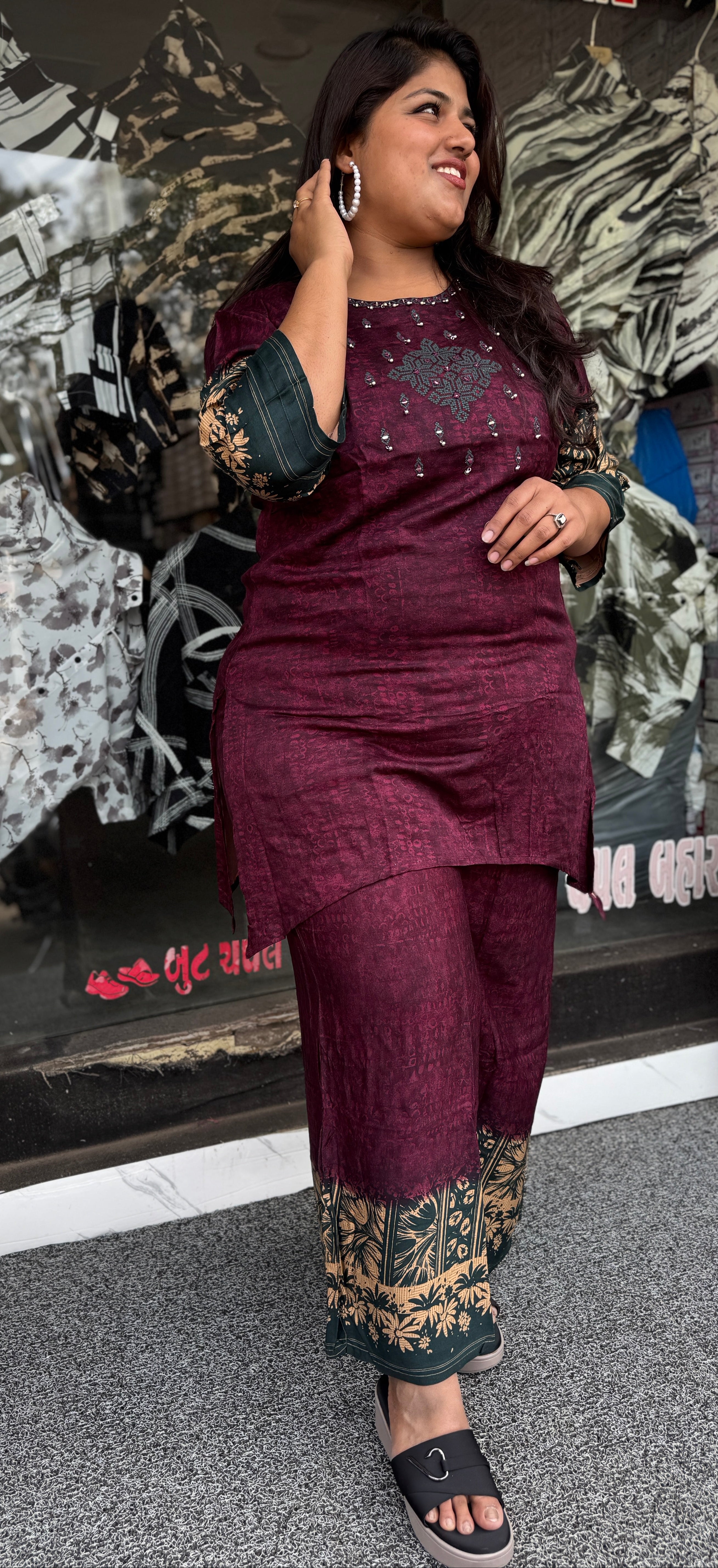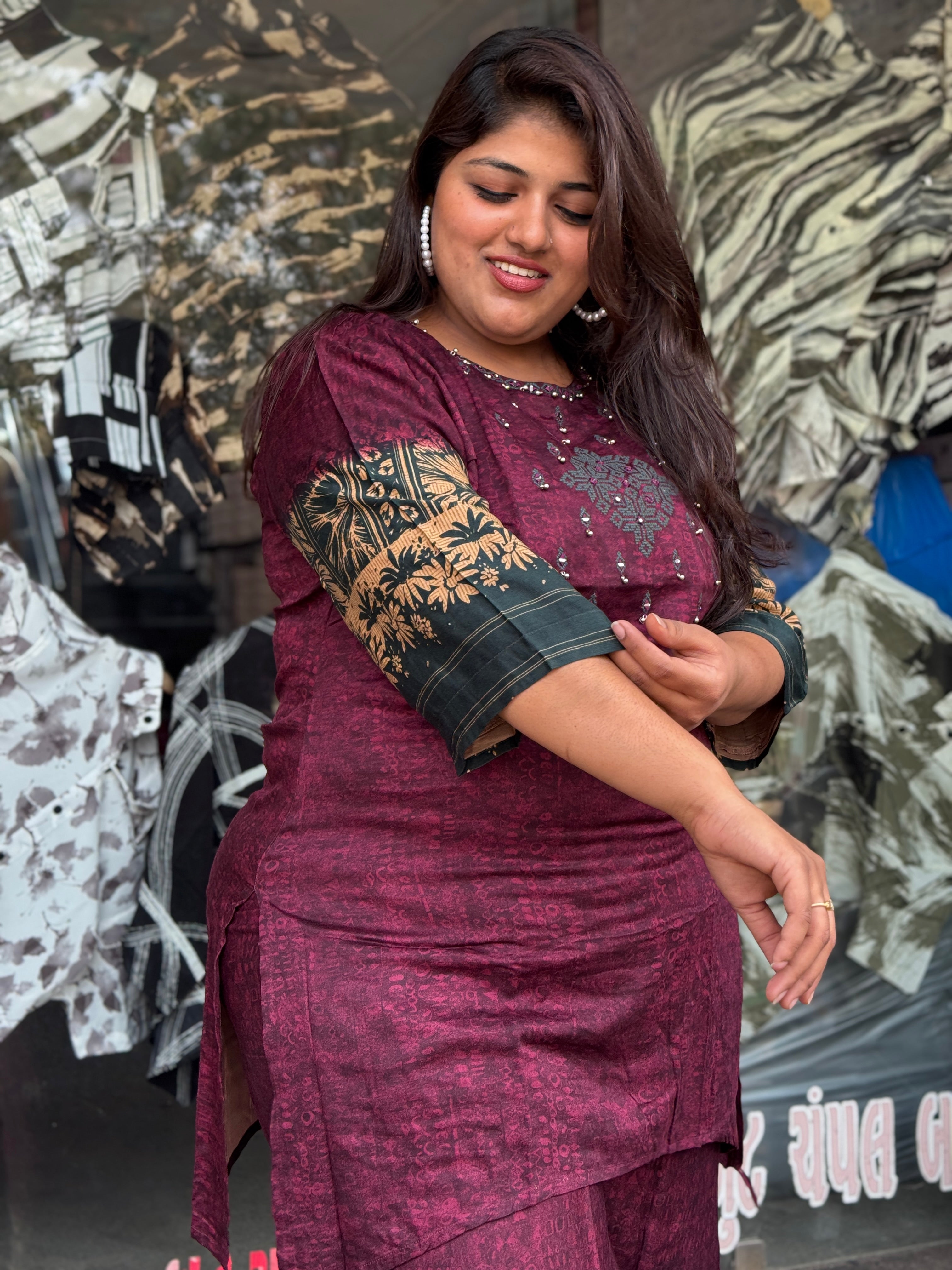 Upgrade your ethnic wardrobe with this elegant wine colour plus size kurta pant set. Crafted in premium German rayon, it is soft, breathable, and specially designed to give a comfortable and flattering fit for curvy women. Perfect for daily wear, festive occasions, and casual outings.