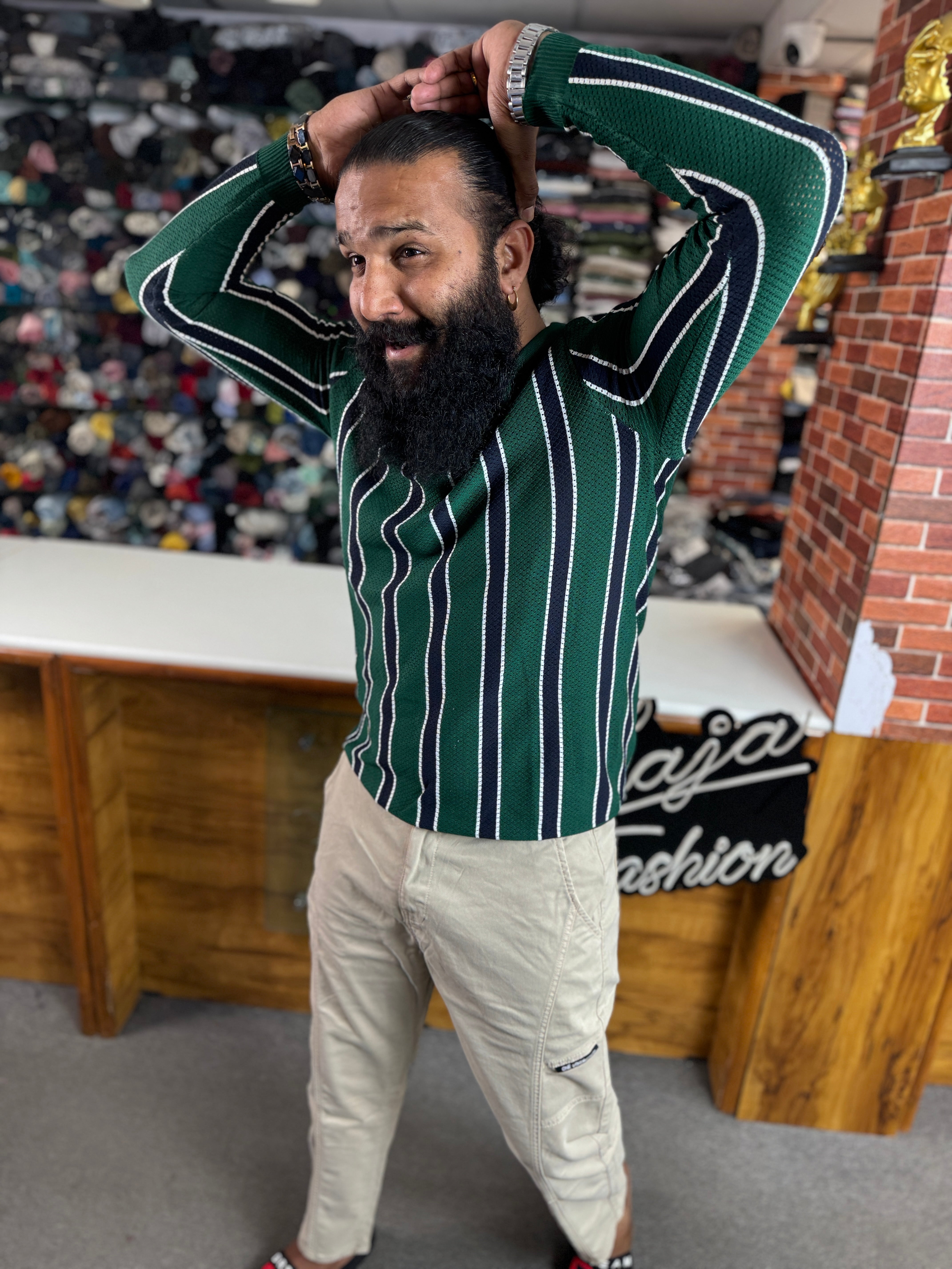 Stylish striped with collar T-Shirt knit Full Sleeves available in Forest Green and Ivory White. Comfortable, classy, and easy to style.