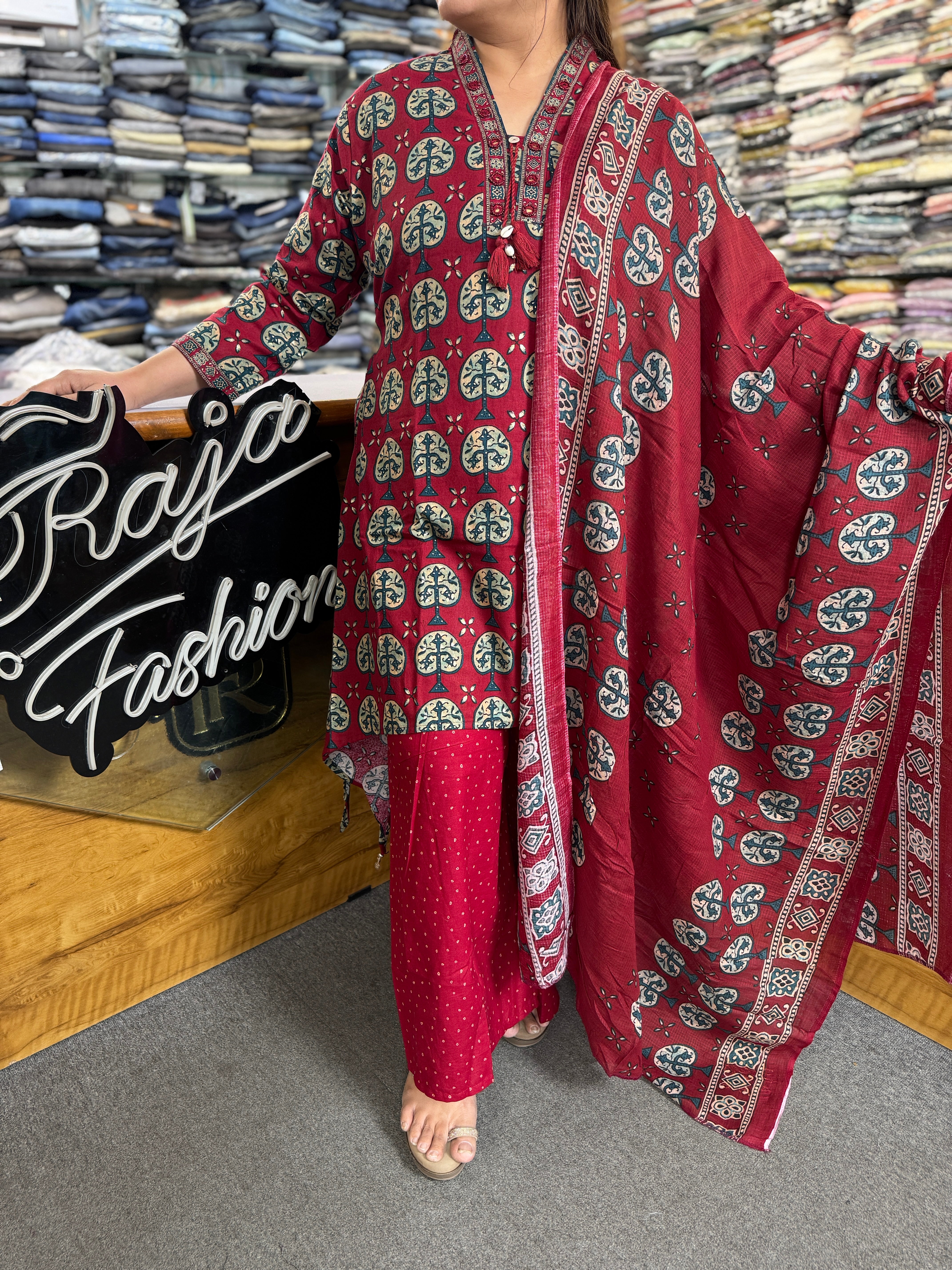 Upgrade your ethnic wardrobe with this elegant Maroon Cotton Printed Kurta Pant Set with Dupatta from Raja Fashion 👑. Designed for comfort and style, this breathable cotton suit features beautiful traditional prints, straight-fit pants, and a matching dupatta for a complete graceful look.