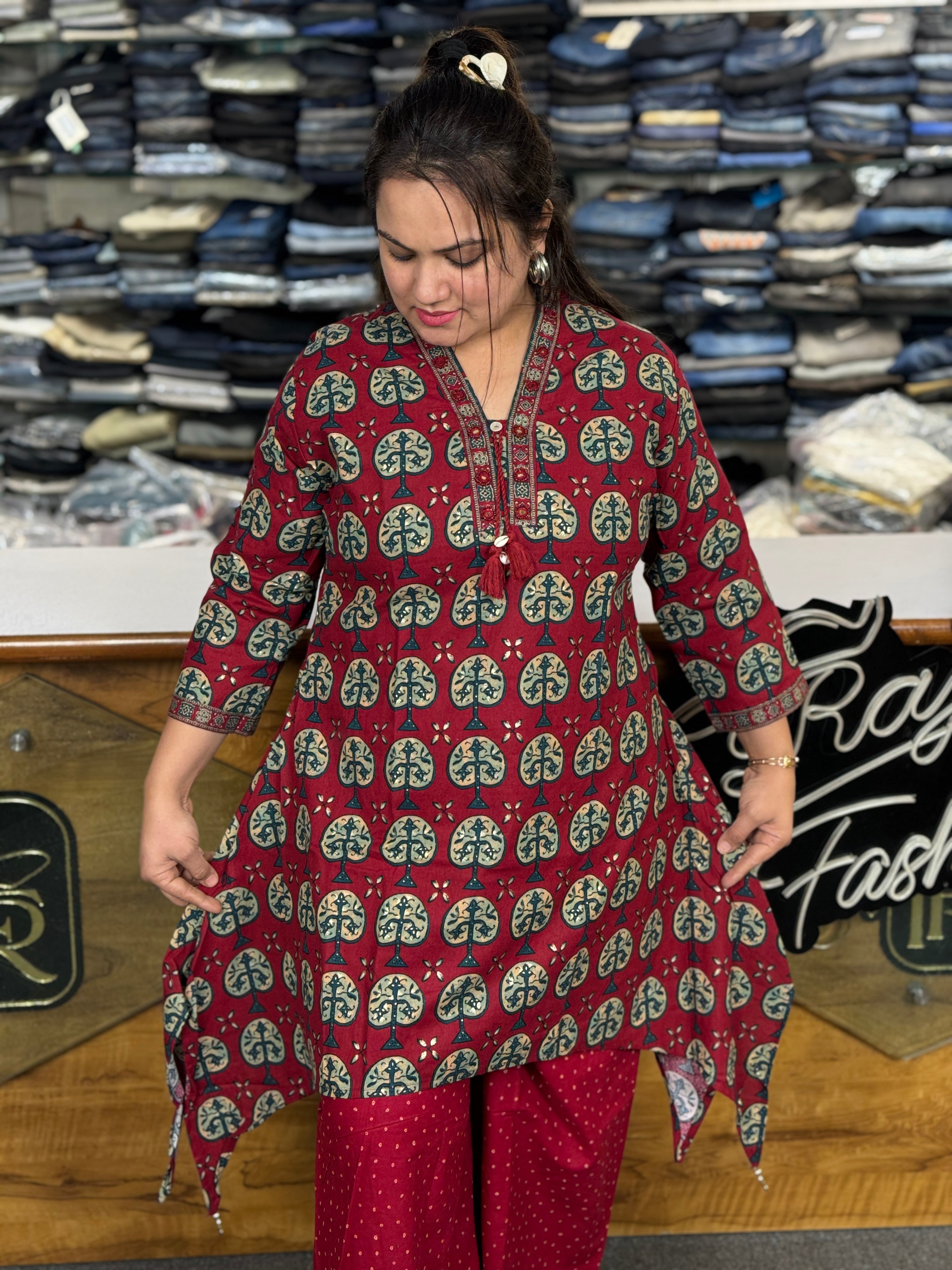 Upgrade your ethnic wardrobe with this elegant Maroon Cotton Printed Kurta Pant Set with Dupatta from Raja...