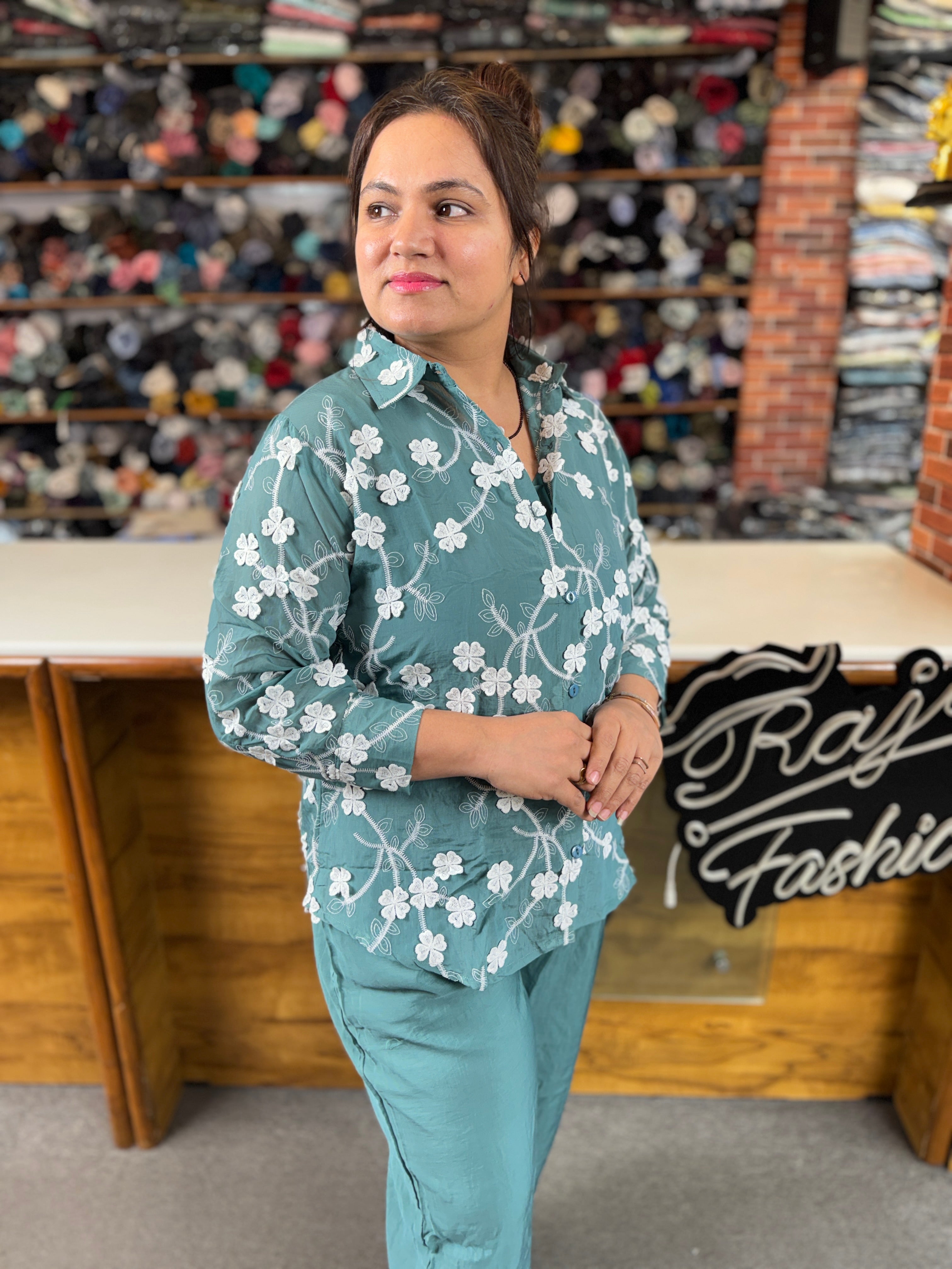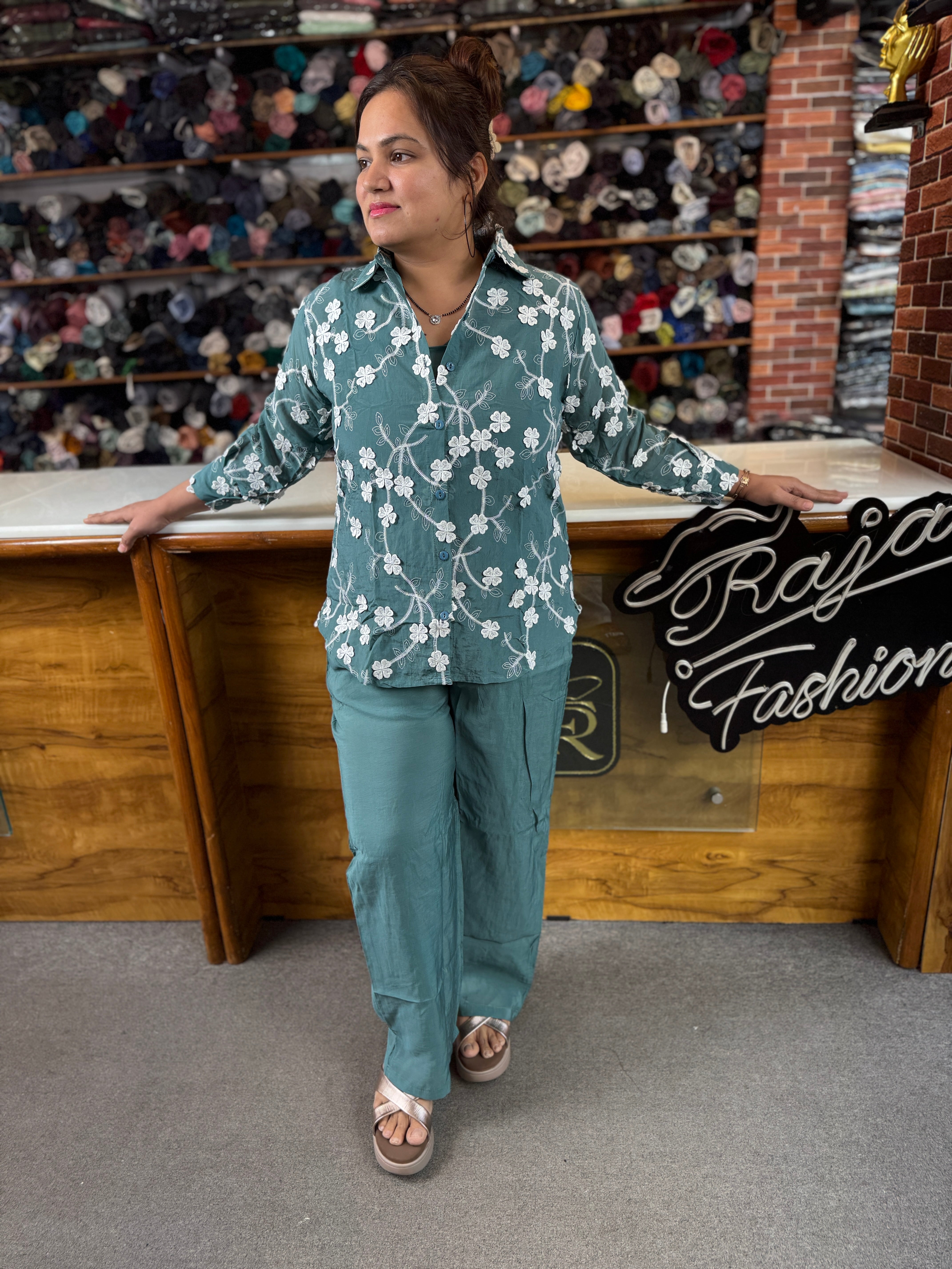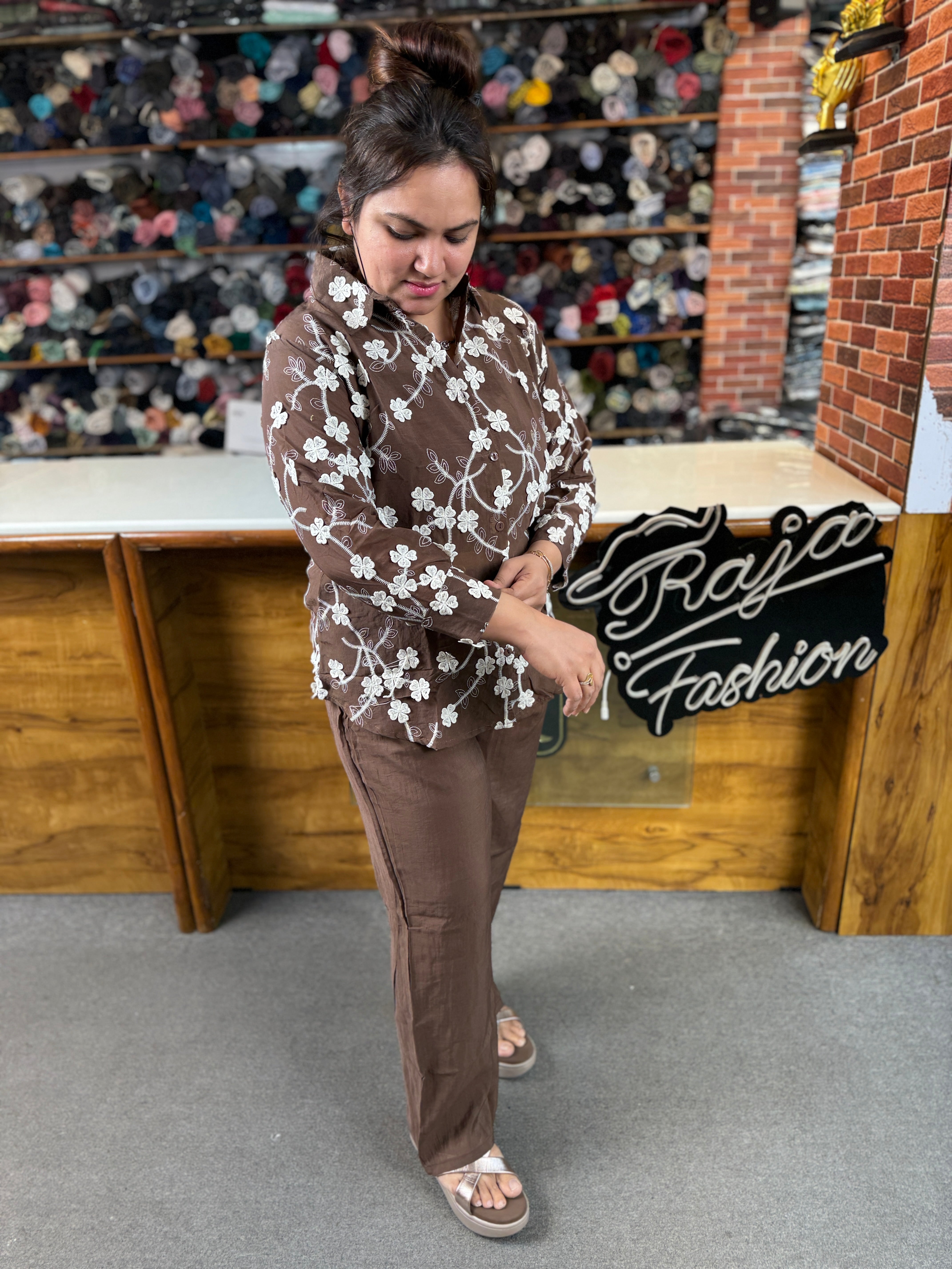 Upgrade your daily style with this elegant floral embroidered co-ord set for women. Made from soft, breathable cotton fabric, this outfit offers all-day comfort with a trendy look. Perfect for casual wear, outings, office, or travel. Available in 4 beautiful colours, this co-ord set features a stylish shirt with matching pants for a complete outfit. Designed to fit waist sizes 28 to 38, it gives a relaxed and flattering fit for every body type.