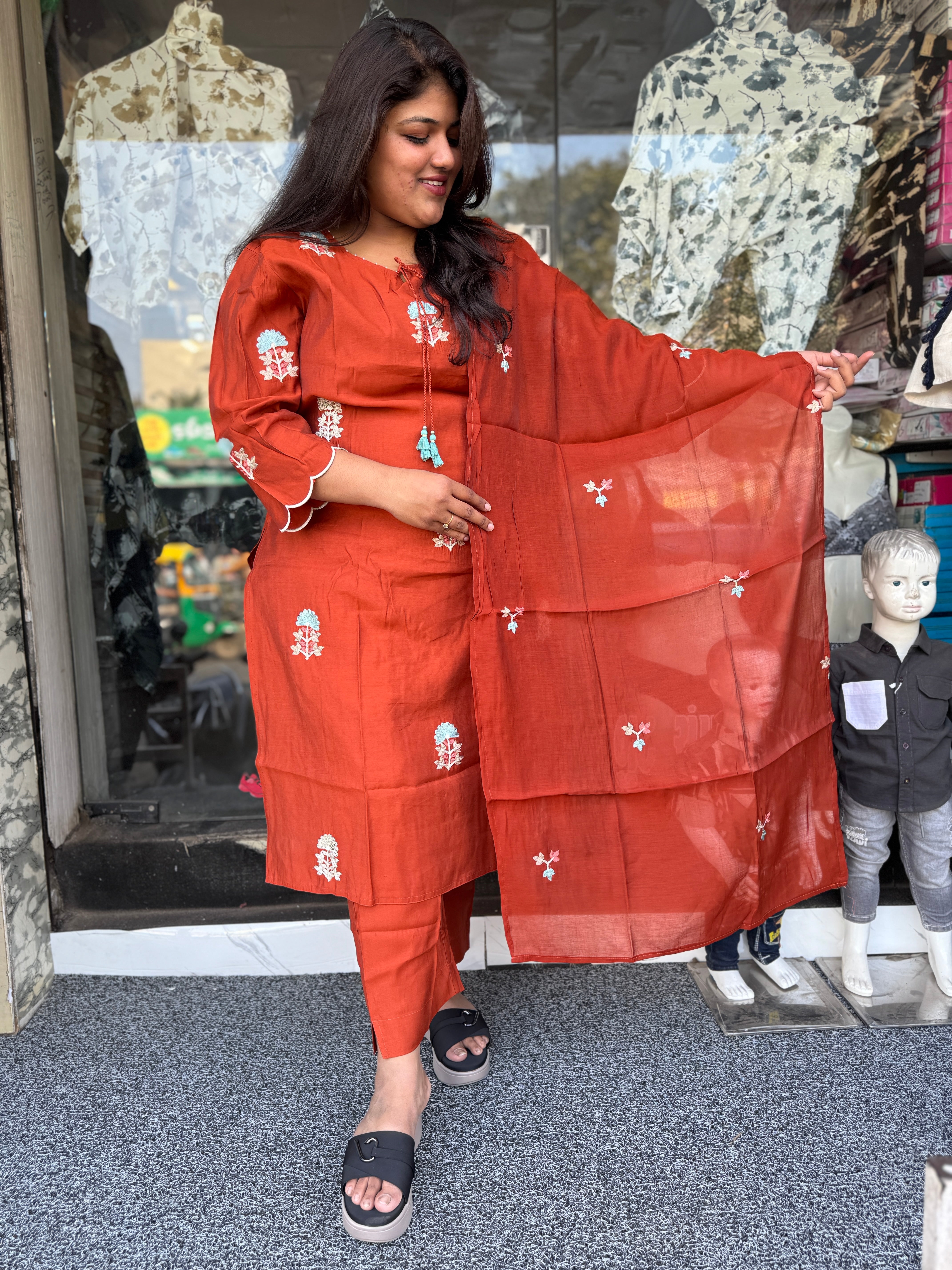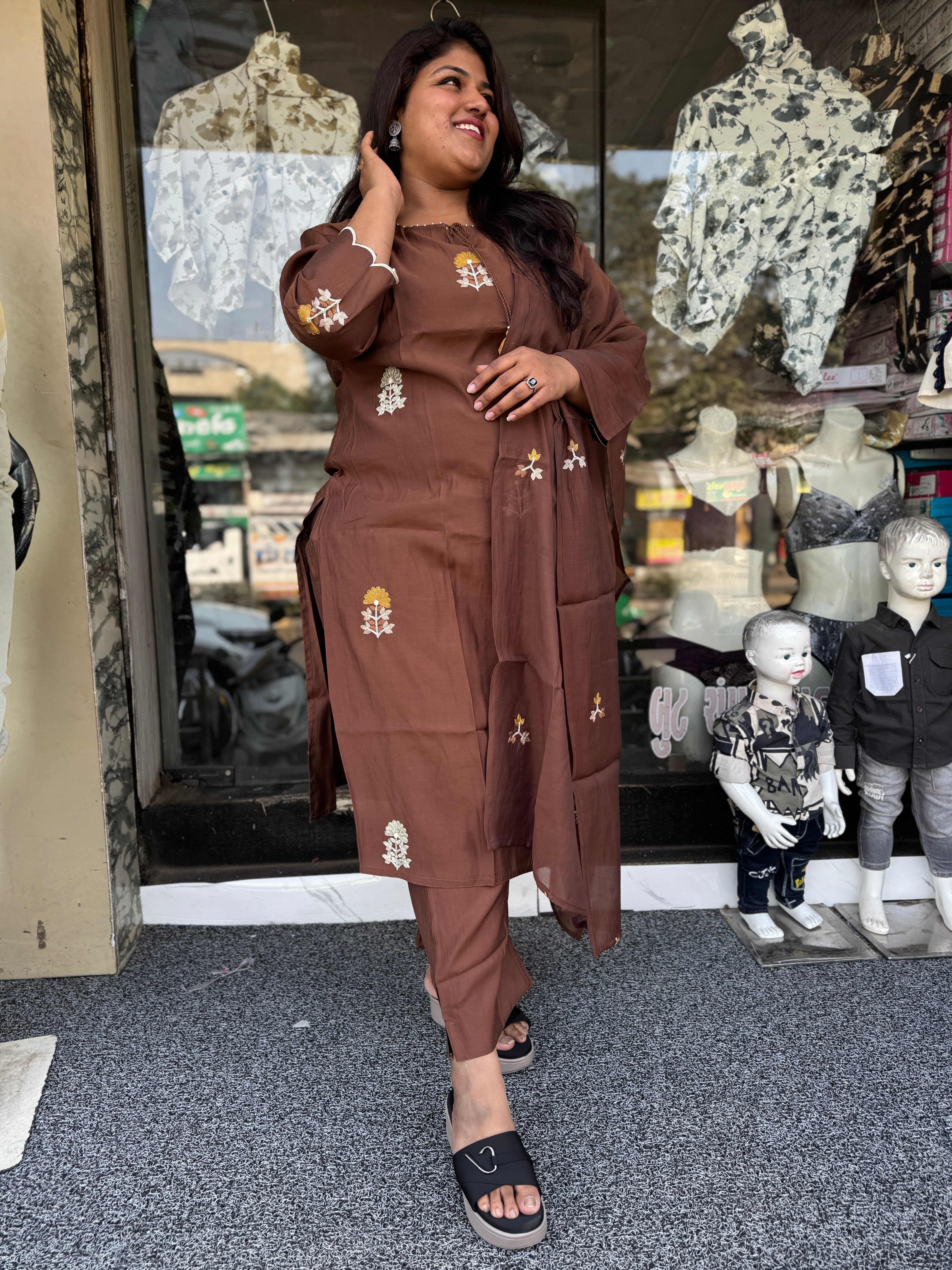 This premium 4-piece kurta set includes an embroidered kurta, soft mal cotton full-length inner, matching pant, and a graceful dupatta. Designed for comfort with an elegant ethnic look.